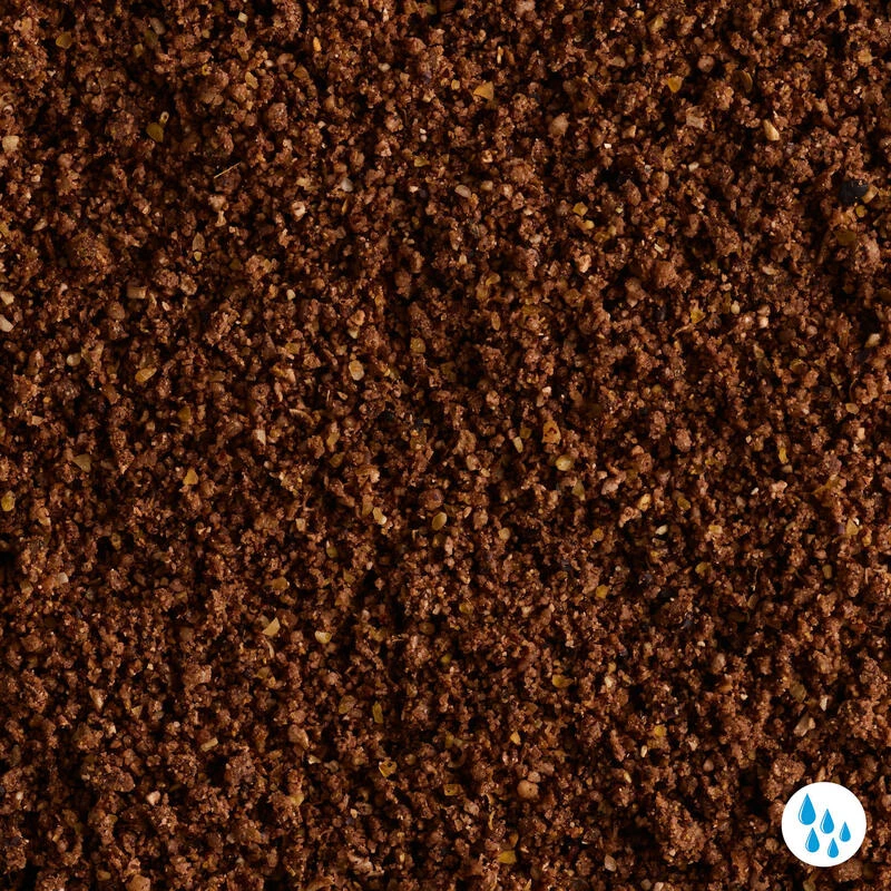 Chapelure, tourteau de coprah, chenevis moulu grillé (15%), biscuit, PV1 (blé, mélasse), maïs, coriandre (9%)