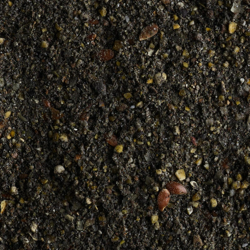 Maïs, chapelure, biscuit, tourteaux de coprah, lin applati (10%), charbon végétal
